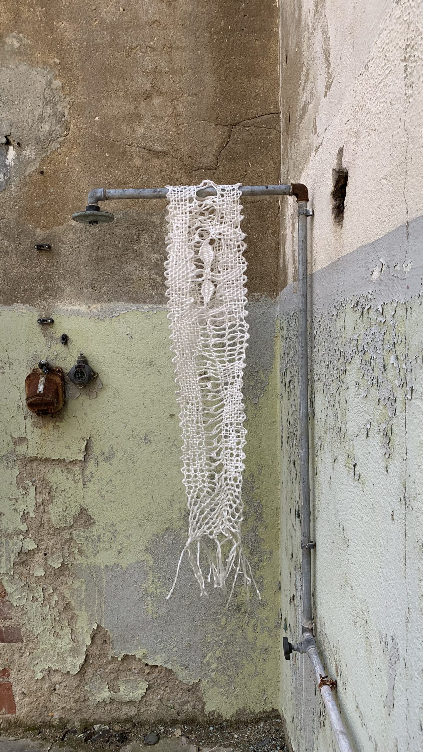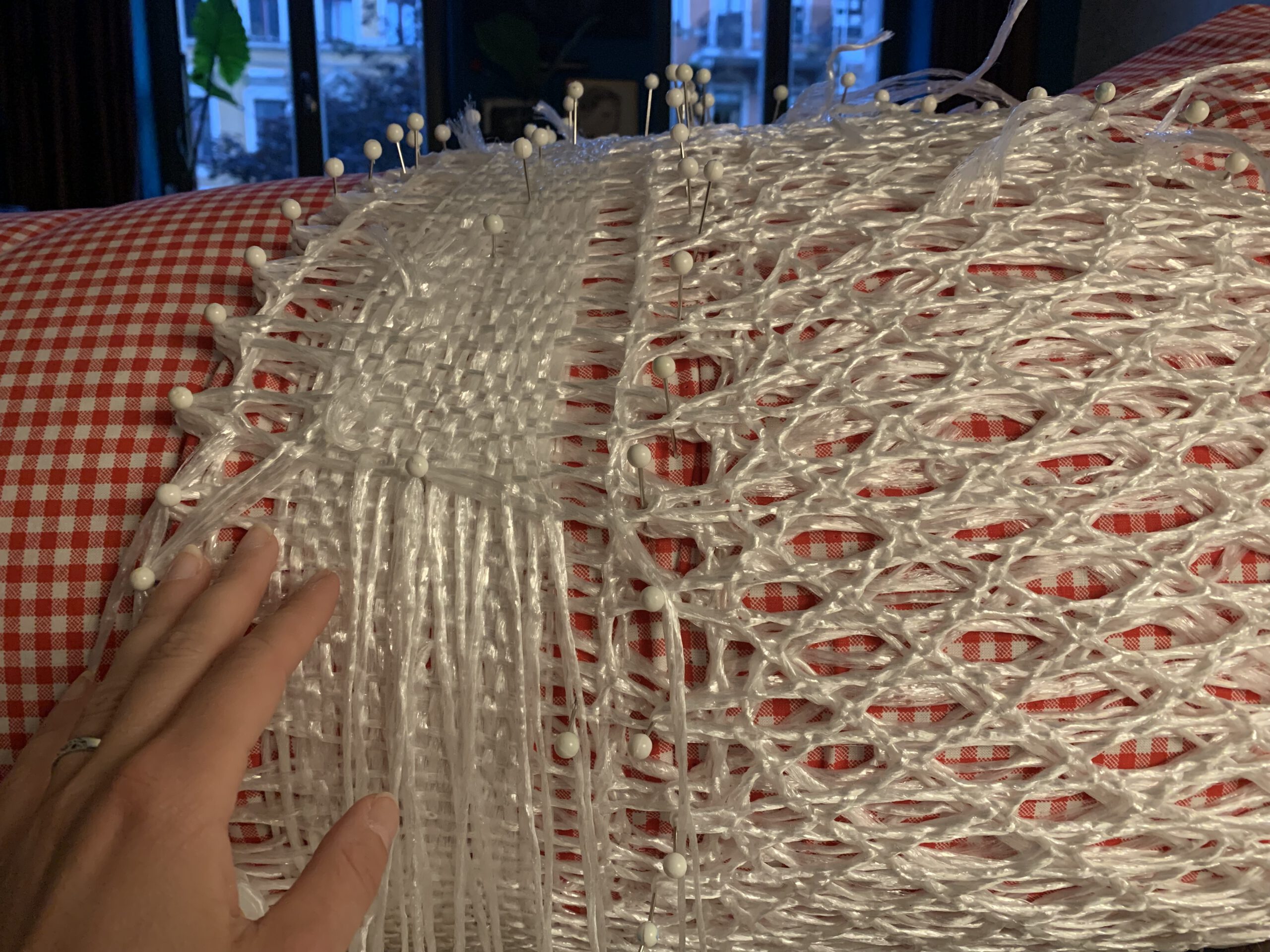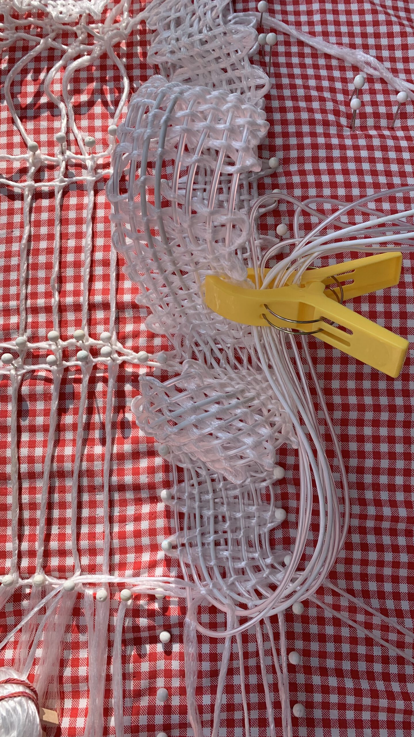 In meiner Arbeit setze ich sowohl sichtbare als auch verborgene Verbindungen ein. Sichtbare Knoten, Spuren des Machens, Unregelmäßigkeiten verweisen bewusst auf die ursprüngliche Handarbeit der Klöppeltechnik – lange bevor sie teilweise durch Maschinen ersetzt wurde. In diesen Dimensionen ist es nicht nur Handarbeit, sondern auch Handwerk. Körperlich anstrengend, schweißtreibend, muskelaufbauend. Das darf sichtbar sein. Ich arbeite fast immer ohne festen Entwurf, entwickle die Motive während des Prozesses, passe Muster an, verwerfe Ideen, probiere Neues. Das Klöppeln wird so selbst zum Experiment.