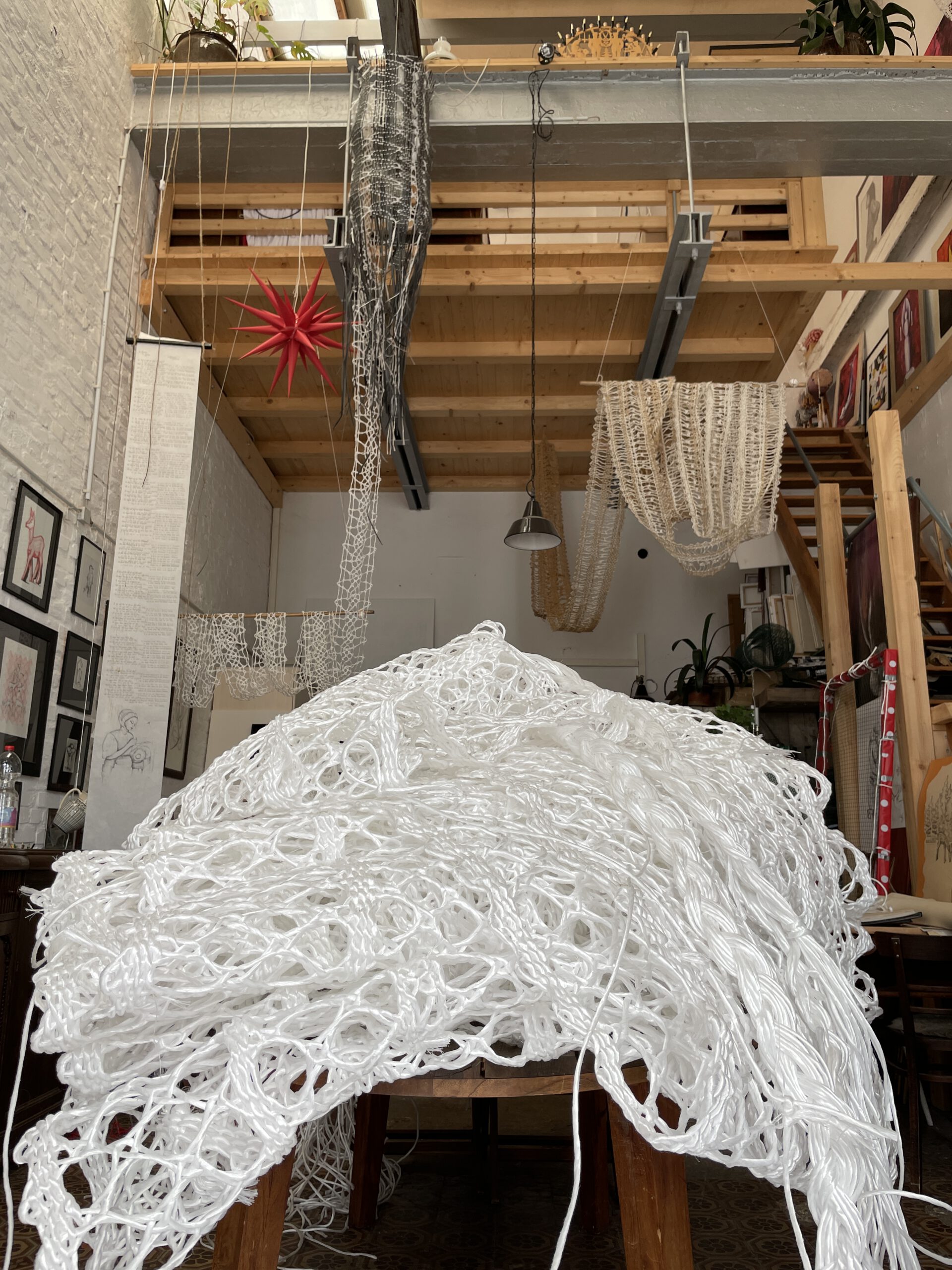 Hinzu kam der veränderte Präsentationskontext an sich, von welchem ich erst Mitte Mai erfuhr. Statt der ursprünglich vorgesehenen Nahbetrachtung erfolgt nun kurzfristig seitens der Stadt die Rezeption aus größerer Entfernung. Dies hat Auswirkung auf die gestalterische Wirkung, insbesondere auf Kontraste, war das Werk durch die Nähe doch ursprünglich in monochromen Weiß gedacht in Anlehnung an die klassisch monochrom geklöppelten Spitzenborten. Bei bereits bestehenden Teilen war nun eine nachträgliche Anpassung nur noch bedingt möglich.