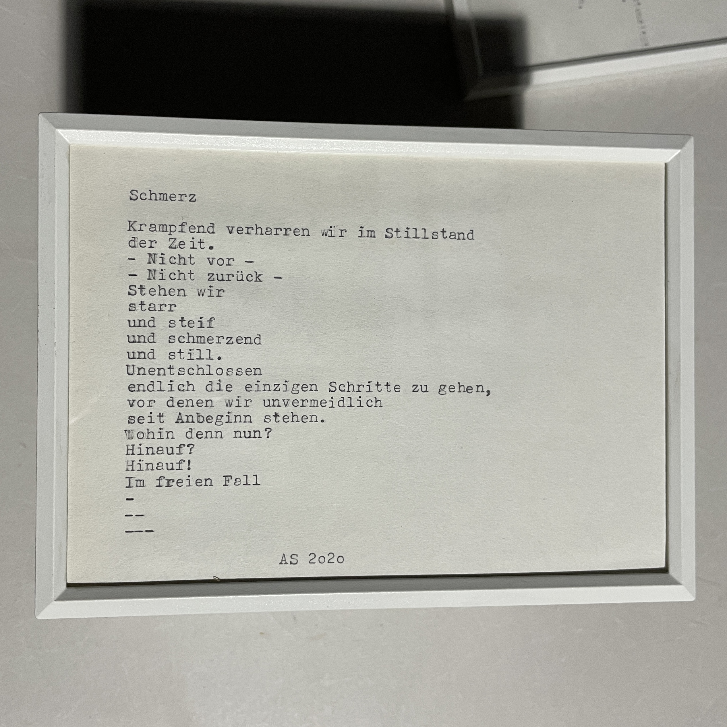 Doch auch das Wort allein beschäftigt mich. Neben Worten für andere im Hintergrund gibt es noch einen weiteren Part seit Jahren. Worte mit und ohne Reim. Inspiriert durch das Innen in mir und das Außen der anderen. Oft entstehend binnen Minuten. Es gibt derer Dutzende, ein kleiner, feiner Ausschnitt einmalig gezeigt auf einer meiner Ausstellungen. Sie fanden Zuspruch und ich weiß, ihre Zeit des Zeigens wird auch noch kommen.